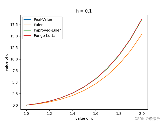 import numpy as npimport mathimport matplotlib.pyplot as pltdef u(x): return pow(x, 2) * (pow(math.e, x) - pow(math.e, 1))def du_dx(x, ux): return (2 / x) * ux + pow(x, 2) * pow(math.e, x)def real_value(a, b, h): t = np.arange(a + h, b + h, h) un = [0] for i in t: un.append(u(i)) print("Real-Values:") print(un) return undef Euler(a, b, h): ''' :param a: 左边界 :param b: 右边界 :param h: 步长 ''' un = [0] # u(1)=0 res = 0 # 以步数划分区间,x=1除外 x=1时u=0 t = np.arange(a, b + h, h) for i in range(len(t) - 1): res = res + h * du_dx(t[i], un[-1]) un.append(res) print("Euler:") print(un) return undef improvedEuler(a, b, h): ''' :param a: 左边界 :param b: 右边界 :param h: 步长 ''' un = [0] # u(1)=0 res = 0 # 以步数划分区间,x=1除外 x=1时u=0 t = np.arange(a, b + h, h) for i in range(len(t) - 1): tempRes = res + h * du_dx(t[i], un[-1]) res = res + (h / 2) * (du_dx(t[i], un[-1]) + du_dx(t[i + 1], tempRes)) un.append(res) print("Improved-Euler:") print(un) return undef runge_kutta(y, x, dx, f): ''' y is un x is tn dx is step_length f is du_dx ''' k1 = f(x, y) k2 = f(x + 0.5 * dx, y + 0.5 * dx * k1) k3 = f(x + 0.5 * dx, y + 0.5 * dx * k2) k4 = f(x + dx, y + dx * k3) return y + dx * (k1 + 2 * k2 + 2 * k3 + k4) / 6.0def cal_runge_kutta(a, b, h, y): ''' :param a: 左边界 :param b: 右边界 :param h: 步长 :param y: u(1)=1 ''' ys, ts = [0], [1.0] while a <= b: y = runge_kutta(y, a, h, du_dx) a += h ys.append(y) ts.append(a) print("Runge-Kutta:") print(ys) return ts, ysif __name__ == '__main__': h = 0.1 # h = 0.05 # h = 0.01 # 存储真实结果 e0 = real_value(1.0, 2.0, h) # 储存Euler结果 e1 = Euler(1.0, 2.0, h) # 储存improvedEuler结果 e2 = improvedEuler(1.0, 2.0, h) # 储存Runge-Kutta结果 ts, ys = cal_runge_kutta(1.0, 2.0, h, 0) # 绘图横坐标 plt.plot(ts, e0, label = 'Real-Value') plt.plot(ts, e1, label = 'Euler') plt.plot(ts, e2, label = 'Improved-Euler') plt.plot(ts, ys, label = 'Runge-Kutta') # 设置横坐标的文字说明 plt.xlabel("value of x") # 设置纵坐标的文字说明 plt.ylabel("value of u") plt.title('h = %s' % h) plt.legend() plt.show() 注:步长可通过修改主函数中的 h h h进行修改。