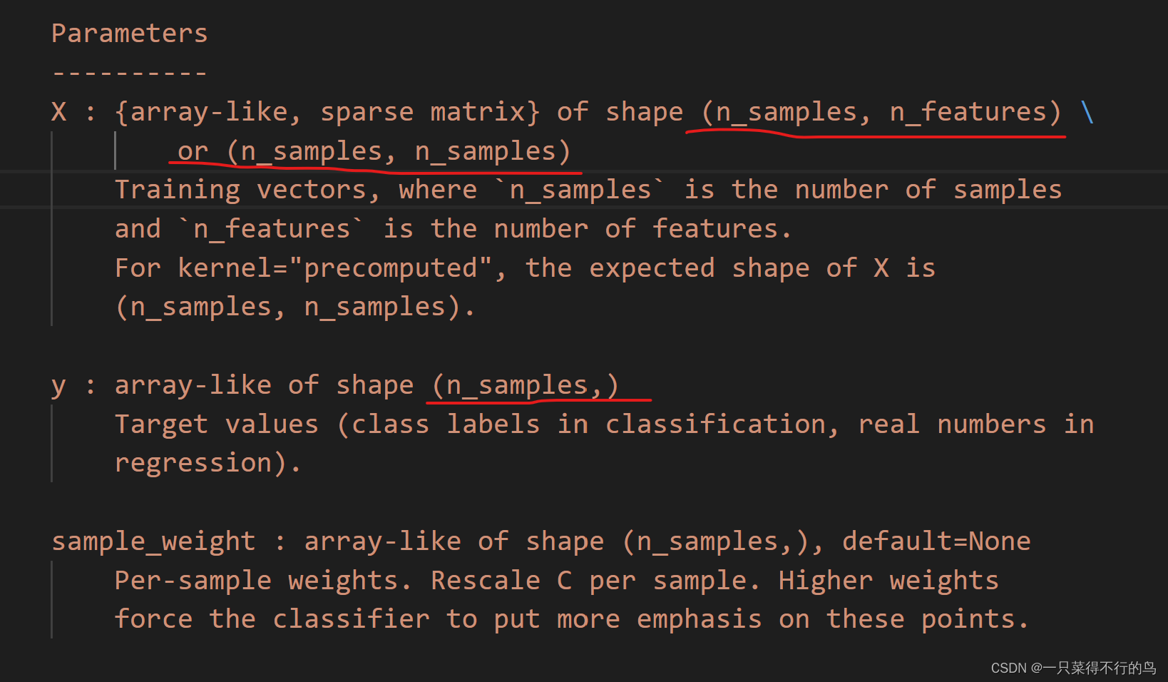 背景:机器学习时关于SVM的学习,之前线性回归、逻辑回归切分数据集时均是将X切分为(输入特征维数,样本数),例如(5,250)代表输入特征是5维,样本数是250个。那是因为之前手敲线性、逻辑回归时用到的数学公式要求维度是这样。但是如果直接使用sklearn库里的现成函数,需要的恰恰相反,即需要(样本数,输入特征维数)这样的格式作为参数的输入。否则报错。