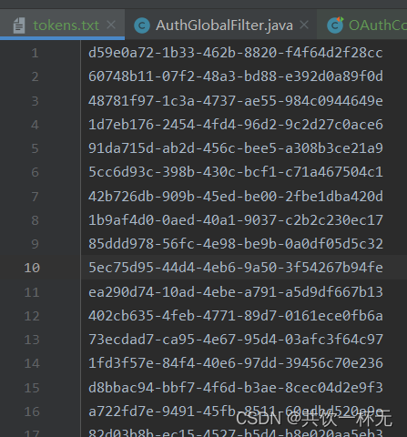 @Test public void writeToken() throws Exception { String authorization = Base64Utils.encodeToString("appId:123456".getBytes()); StringBuffer tokens = new StringBuffer(); for (int i = 0; i < 2000; i++) { MvcResult mvcResult = super.mockMvc.perform(MockMvcRequestBuilders.post("/oauth/token") .header("Authorization", "Basic " + authorization) .contentType(MediaType.APPLICATION_FORM_URLENCODED) .param("username", "test" + i) .param("password", "123456") .param("grant_type", "password") .param("scope", "api") ) .andExpect(status().isOk()) // .andDo(print()) .andReturn(); String contentAsString = mvcResult.getResponse().getContentAsString(); ResultInfo resultInfo = (ResultInfo) JSONUtil.toBean(contentAsString, ResultInfo.class); JSONObject result = (JSONObject) resultInfo.getData(); String token = result.getStr("accessToken"); tokens.append(token).append("\r\n"); } Files.write(Paths.get("tokens.txt"), tokens.toString().getBytes()); }
