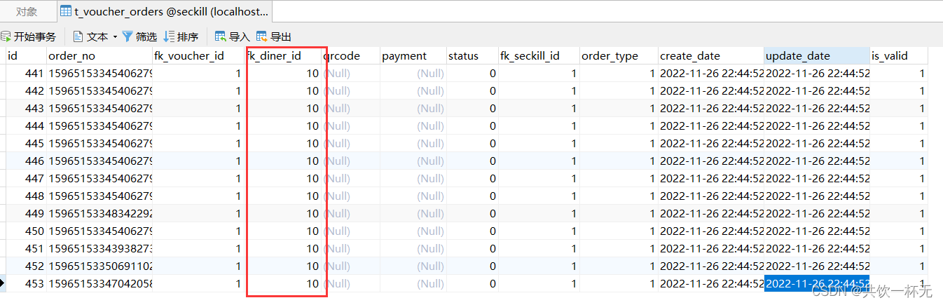 /** * 减库存 * @param seckillId 秒杀id * @return */ @Update("update t_seckill_vouchers set amount = amount - 1 " + " where id = #{seckillId}") int stockDecrease(@Param("seckillId") int seckillId); 测试验证