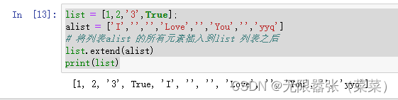 list = [1,2,'3',True];alist = ['I','','','Love','','You','','yyq']# 将列表alist 的所有元素插入到list 列表之后list.extend(alist)print(list)