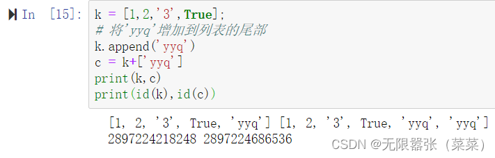 k = [1,2,'3',True];# 将'yyq'增加到列表的尾部k.append('yyq')c = k+['yyq']print(k,c)print(id(k),id(c))
