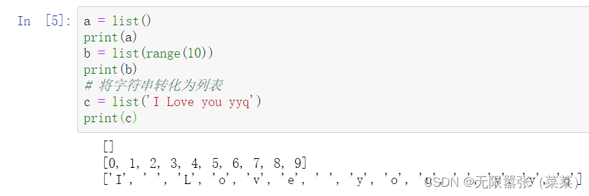 a = list()print(a)b = list(range(10))print(b)# 将字符串转化为列表c = list('I Love you yyq')print(c)