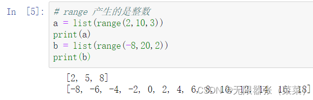 # range 产生的是整数a = list(range(2,10,3))print(a)b = list(range(-8,20,2))print(b)