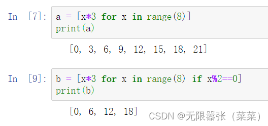 a = [x*3 for x in range(8)]print(a)b = [x*3 for x in range(8) if x%2==0]print(b)