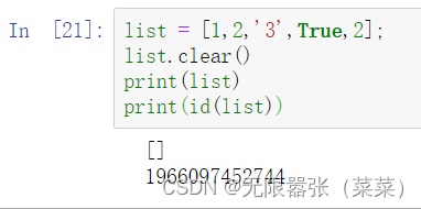list = [1,2,'3',True,2];list.clear()print(list)print(id(list))
