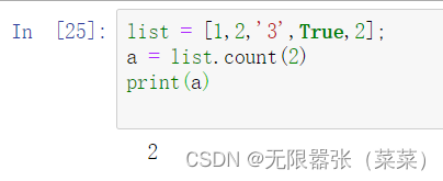 list = [1,2,'3',True,2];a = list.count(2)print(a)