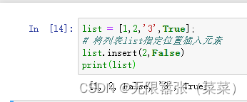 list = [1,2,'3',True];# 将列表list指定位置插入元素list.insert(2,False)print(list)