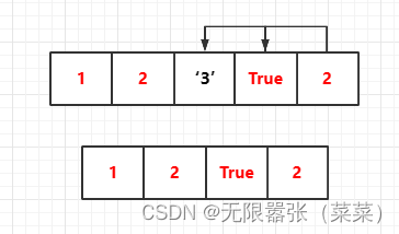 5.删除并返回列表list指定位置index处的元素,或者del list[2],默认是最后一个元素,索引是从0开始的.看似是元素的删除,实际里边涉及到数组的移动和拷贝。将字符’3’删除以后,将索引3位置移动到索引2位置,将索引4位置移动到索引3的位置。别的列表中间操作,同理。