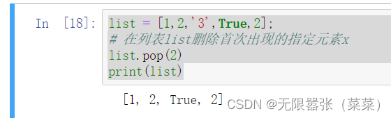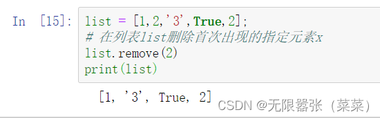 list = [1,2,'3',True,2];# 在列表list删除首次出现的指定元素xlist.remove(2)print(list)
