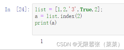 list = [1,2,'3',True,2];a = list.index(2)print(a)