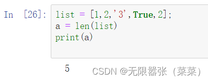 list = [1,2,'3',True,2];a = len(list)print(a)