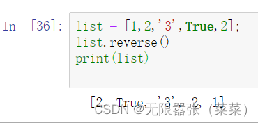 list = [1,2,'3',True,2];list.reverse()print(list)