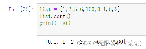 list = [1,2,5,6,100,0.1,6,2];list.sort()print(list)
