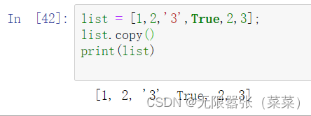 list = [1,2,'3',True,2,3];list.copy()print(list)