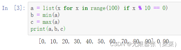 a = list(x for x in range(100) if x % 10 == 0)b = min(a)c = max(a)print(a,b,c)