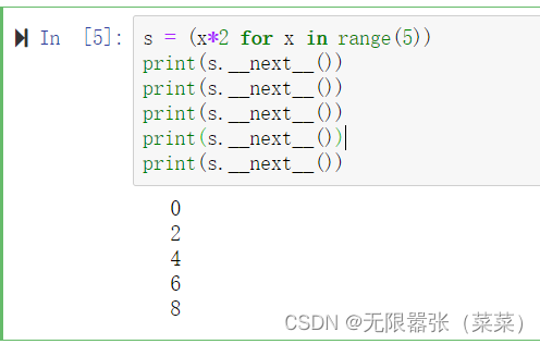 s = (x*2 for x in range(5))print(s.__next__())print(s.__next__())print(s.__next__())print(s.__next__())print(s.__next__())