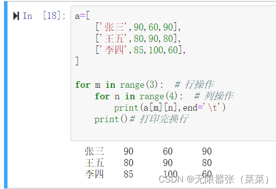 a=[ ['张三',90,60,90], ['王五',80,90,80], ['李四',85,100,60],]for m in range(3): # 行操作 for n in range(4): # 列操作 print(a[m][n],end='\t') print()# 打印完换行 元组tuple