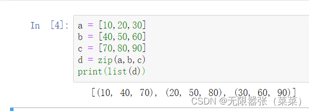 a = [10,20,30]b = [40,50,60]c = [70,80,90]d = zip(a,b,c)print(list(d))