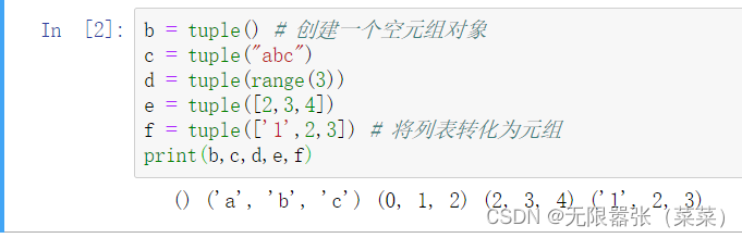b = tuple() # 创建一个空元组对象c = tuple("abc")d = tuple(range(3))e = tuple([2,3,4])f = tuple(['1',2,3]) # 将列表转化为元组print(b,c,d,e,f)