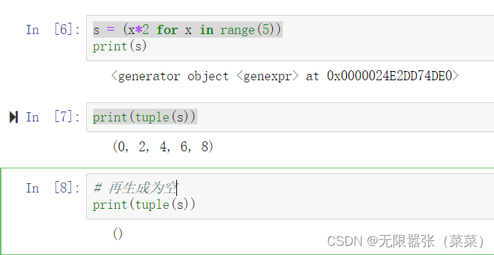 从形式上看,生成器推导式与列表推导式类似,只是生成器推导式使用小括号,列表推导式生成列表对象,生成器推导式生成的不是列表也不是元组,而是一个生成器对象。我们可以通过生成器对象,转化成列表或者元组。也可以使用生成器对象的_next_()方法进行遍历,或者直接作为迭代器对象来使用。不管什么方式使用,元素访问结束后,如果需要重新访问其中的元素,必须重新创建该生成器对象,只能用一次。