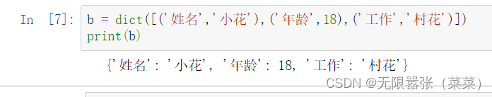 b = dict([('姓名','小花'),('年龄',18),('工作','村花')])print(b)