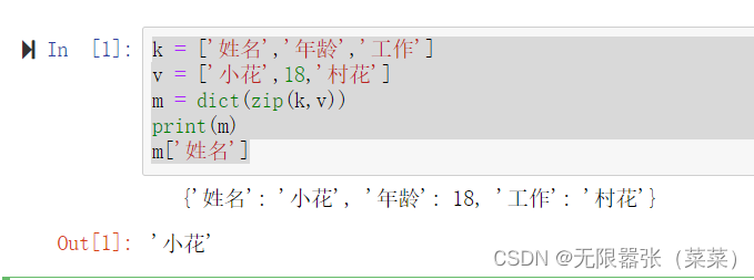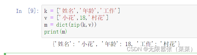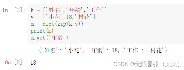 k = ['姓名','年龄','工作']v = ['小花',18,'村花']m = dict(zip(k,v))print(m)
