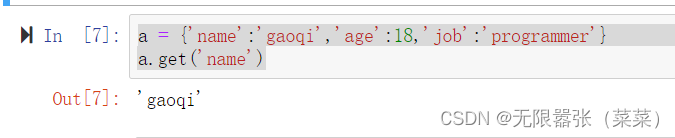 a = {'name':'gaoqi','age':18,'job':'programmer'}a.get('name')