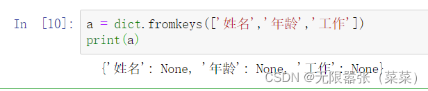 a = dict.fromkeys(['姓名','年龄','工作'])print(a)