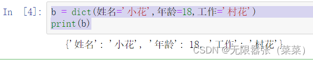 b = dict(姓名='小花',年龄=18,工作='村花')print(b)