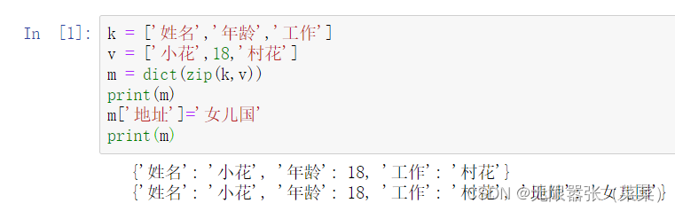 k = ['姓名','年龄','工作']v = ['小花',18,'村花']m = dict(zip(k,v))print(m)m['地址']='女儿国'print(m)