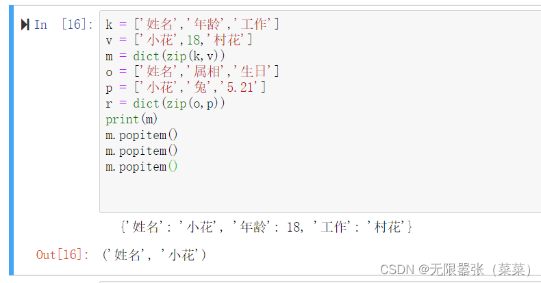 k = ['姓名','年龄','工作']v = ['小花',18,'村花']m = dict(zip(k,v))o = ['姓名','属相','生日']p = ['小花','兔','5.21']r = dict(zip(o,p))print(m)m.popitem()m.popitem()m.popitem()