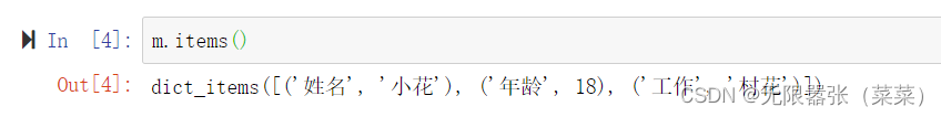 k = ['姓名','年龄','工作']v = ['小花',18,'村花']m = dict(zip(k,v))print(m)m['姓名']