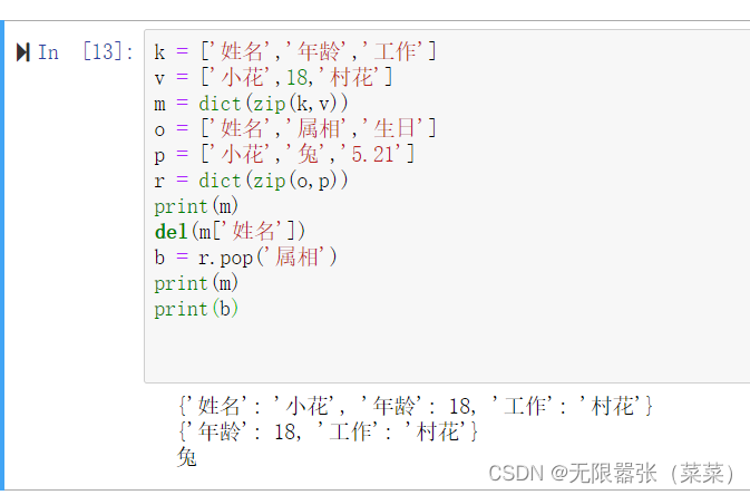 k = ['姓名','年龄','工作']v = ['小花',18,'村花']m = dict(zip(k,v))o = ['姓名','属相','生日']p = ['小花','兔','5.21']r = dict(zip(o,p))print(m)del(m['姓名'])b = r.pop('属相')print(m)print(b)