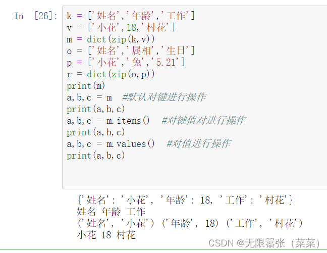 k = ['姓名','年龄','工作']v = ['小花',18,'村花']m = dict(zip(k,v))o = ['姓名','属相','生日']p = ['小花','兔','5.21']r = dict(zip(o,p))print(m)a,b,c = m #默认对键进行操作print(a,b,c)a,b,c = m.items() #对键值对进行操作print(a,b,c)a,b,c = m.values() #对值进行操作print(a,b,c)
