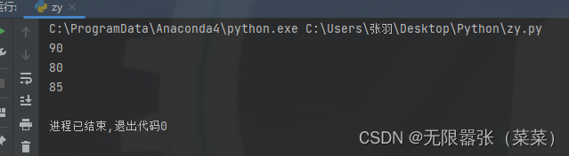 a1 = {'姓名': '张三', '语文成绩': 90, '数学成绩': '60', '英语成绩': '90'}a2 = {'姓名': '王五', '语文成绩': 80, '数学成绩': '90', '英语成绩': '80'}a3 = {'姓名': '李四', '语文成绩': 85, '数学成绩': '100', '英语成绩': '60'}tb = [a1, a2, a3]# 获得语文成绩for i in range(len(tb)): print(tb[i].get('语文成绩'))
