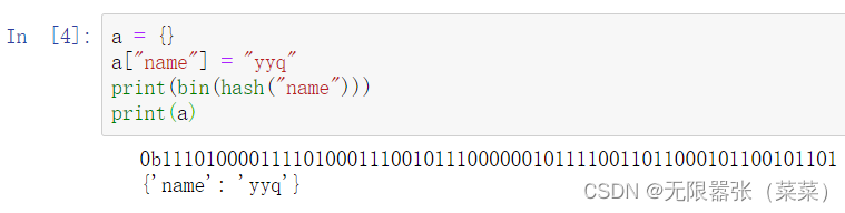 a = {}a["name"] = "yyq"print(bin(hash("name")))print(a)
