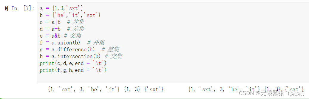 a = {1,3,'sxt'}b = {'he','it','sxt'}c = a|b # 并集d = a-b # 差集e = a&b # 交集f = a.union(b) # 并集g = a.difference(b) # 差集h = a.intersection(b) # 交集print(c,d,e,end = '\t')print(f,g,h,end = '\t') 总结(列表、元组、字典、集合区别)