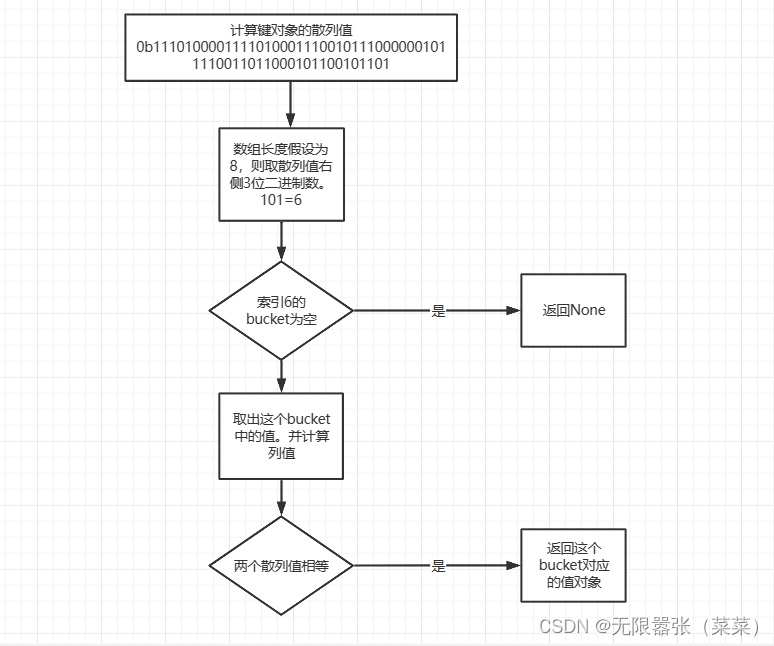 和存储的底层流程算法一致,也是依次取散列值的不同位置的数字,假设数组长度为8,我们可以拿计算出的散列值的最右边3位数字作为偏移量,即“101”,十进制是数字5。我们查看偏移量5,对应的bucket是否为空。如果为空,则返回None。如果不为空,则将这个bucket的键对象计算对应的散列值,和我们的散列值进行比较,如果相等。则将对应的”值对象”返回。如果不相等,则依次取其他几位数字,重新计算偏移量。重新取完后仍然没有找到,则返回None,流程图如下: