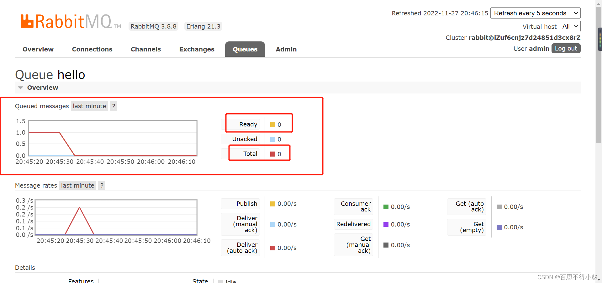 public class Consumer { public static final String QUEUE_NAME = "hello"; public static void main(String[] args) throws IOException, TimeoutException { // 创建连接工厂 ConnectionFactory factory = new ConnectionFactory(); // 工厂IP factory.setHost("xxx.xxx.xxx.xxx"); // 用户名 factory.setUsername("admin"); factory.setPassword("123"); Connection connection = factory.newConnection(); Channel channel = connection.createChannel(); // 消费消息 // 声明 接收消息 DeliverCallback deliverCallback = (consumerTag, message) ->{ System.out.println(new String(message.getBody())); }; // 取消消息回调 CancelCallback cancelCallback = consumerTag ->{ System.out.println("消息消费中断"); }; /** * 1.消费那个队列 * 2.消费成功之后是否要自动应答 true 自动应答 false 手动应答 * 3.消费者未成功消费的回调 * 4.消费者取消消费的回调 **/ channel.basicConsume(QUEUE_NAME,true,deliverCallback,cancelCallback); }} 测试运行,进入后台管理页面,队列中的消息数据已经被成功消费。