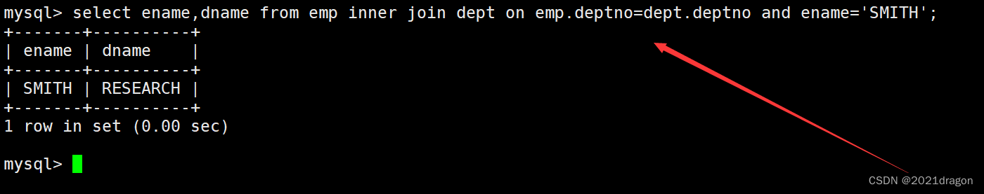 将员工表和部门号放在from子句中并通过inner join关键字隔开。在on子句后指明内连接的条件为员工的部门号等于部门的部门号,保证筛选出来的数据是有意义的。在and之后指明筛选条件为员工的姓名为SMITH。这样筛选出来的结果和多表查询筛选出来的结果是一样的,只不过是写法有一点不同而已。如下: