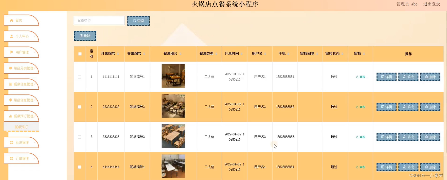 管理员可以查询已预定的餐桌,并进行审核。餐桌预定功能的实现界面如下图所示: