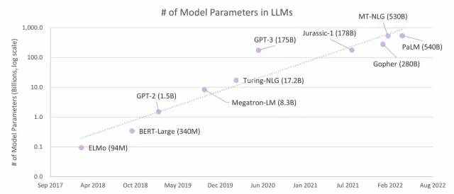 语言模型已经存在了几十年。当下LLM性能的背后是数十亿参数的高效深度神经网络(DNN)驱动。参数是用于训练和预测的矩阵权重,浮点运算(FLOPS)的数值通常与参数数量(parameter count)成比例。这些运算是在针对矩阵运算优化的处理器上计算的,例如GPU、TPU和其他专用芯片。