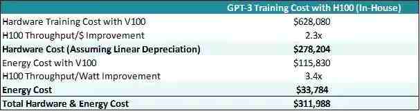 仅从V100(用于训练 GPT-3)到即将推出的H100的改进来看,我们预计内部训练成本将降低58%(即训练成本由74.4万美元降低到31.2万美元)。