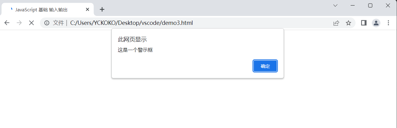 <!DOCTYPE html><html lang="en"><head> <meta charset="UTF-8"> <title>JavaScript 基础 输入输出</title></head><body> <script> // 1. 浏览器弹出警示框 alert('这是一个警示框'); // 2. 浏览器弹出输入框,用户可以输入内容 prompt('这是一个输入框'); //3.浏览器控制台输出信息 console.log('在控制台打印输出的信息'); </script></body></html> 1,alert使用效果