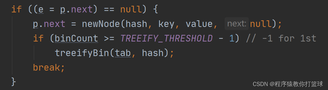 比较该数组索引 i 下标的下一个节点,如果为 null,则直接插入该节点,如果链表长度大于8,则可能需要树化,也就是转换成红黑树,如果找到了相同的 key,则不用插入直接跳出循环。