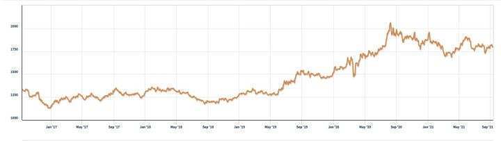 图 1:黄金每日价格,每金衡盎司美元。 资料来源:伦敦金银市场协会,2021 年 9 月 11 日