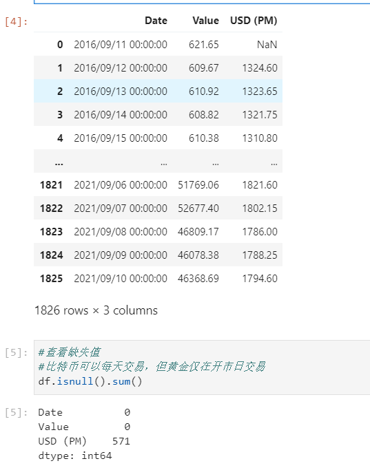 将合并后数据进行查看确实值,可以看到,黄金存在缺失值,且缺失了571个数值,这是因为比特币可以每天交易,但黄金仅在开市日交易导致的