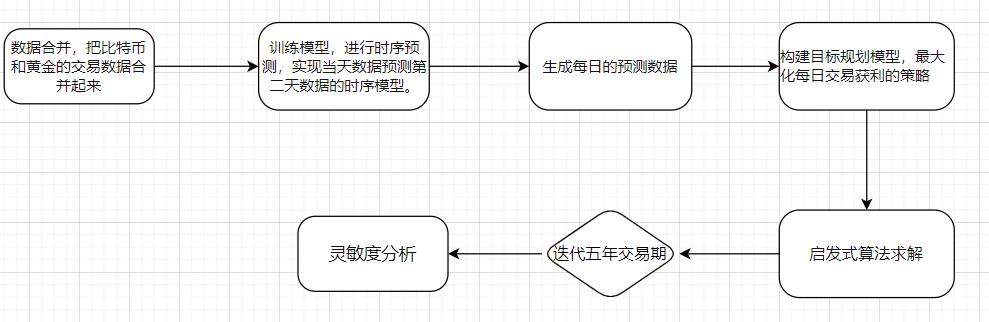在进行预测后,我们需要得到买入-出售-保持这样的交易策略,其中,黄金仅在开市日的交易,这说明在周末或者节假日,交易状态一定是持有,可以分别保留黄金和比特币的共同交易日数据来进行分析。假设黄金-比特币是同买同卖的,主要设计到的是一个收益率这样一个时间序列数据,比如,我们可以在任一一天进行买入,我们可以用(预测某天金子的价格/购买金子的实际价格-1)来得到收益率,当涨幅达到某个值的,建议卖出。