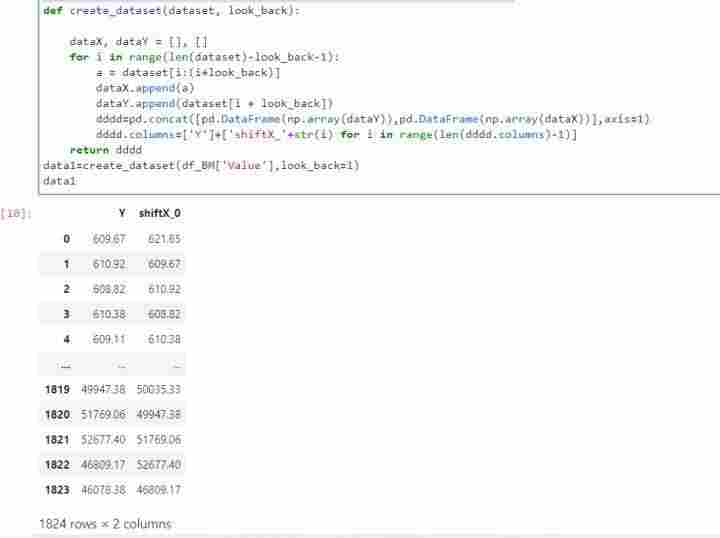 其中,dataset为数据集, look_back为步阶,如上图所示,为比特币步阶为1时的滑窗转换结果。